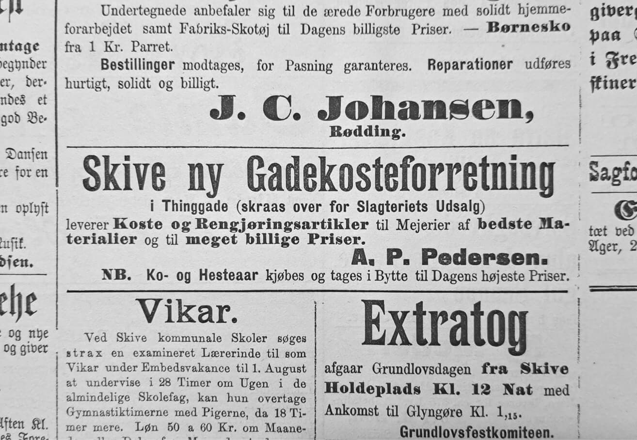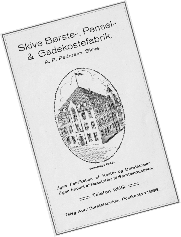 On May 1st, 1898, Anders Peter Pedersen (1869-1954) started manufacturing brushes in Skive. He was taught by brushmaker Søren Christensen after the two served in the military together. A.P. Pedersen rented a backroom in Thinggade 7, and that is where he opened “Skive ny Gadekosteforretning”.
