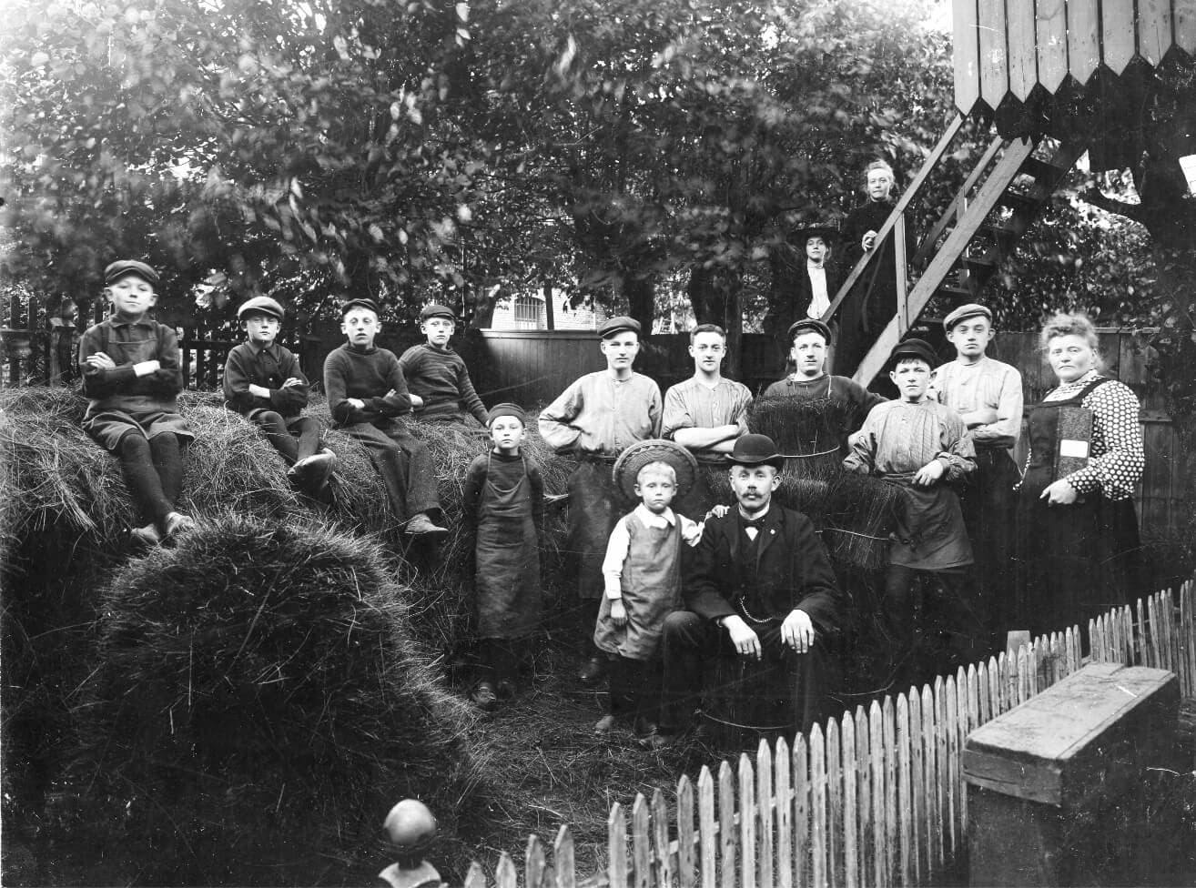 Front row from the left: A.P. Pedersen, Miss Jensen with Gunnar Pedersen (son – with a hammer in the hand), Carl Vilhelm Pedersen (son), Sørensen, Peder Poulsen, Ella Pedersen (daughter) and Holger Jensen.