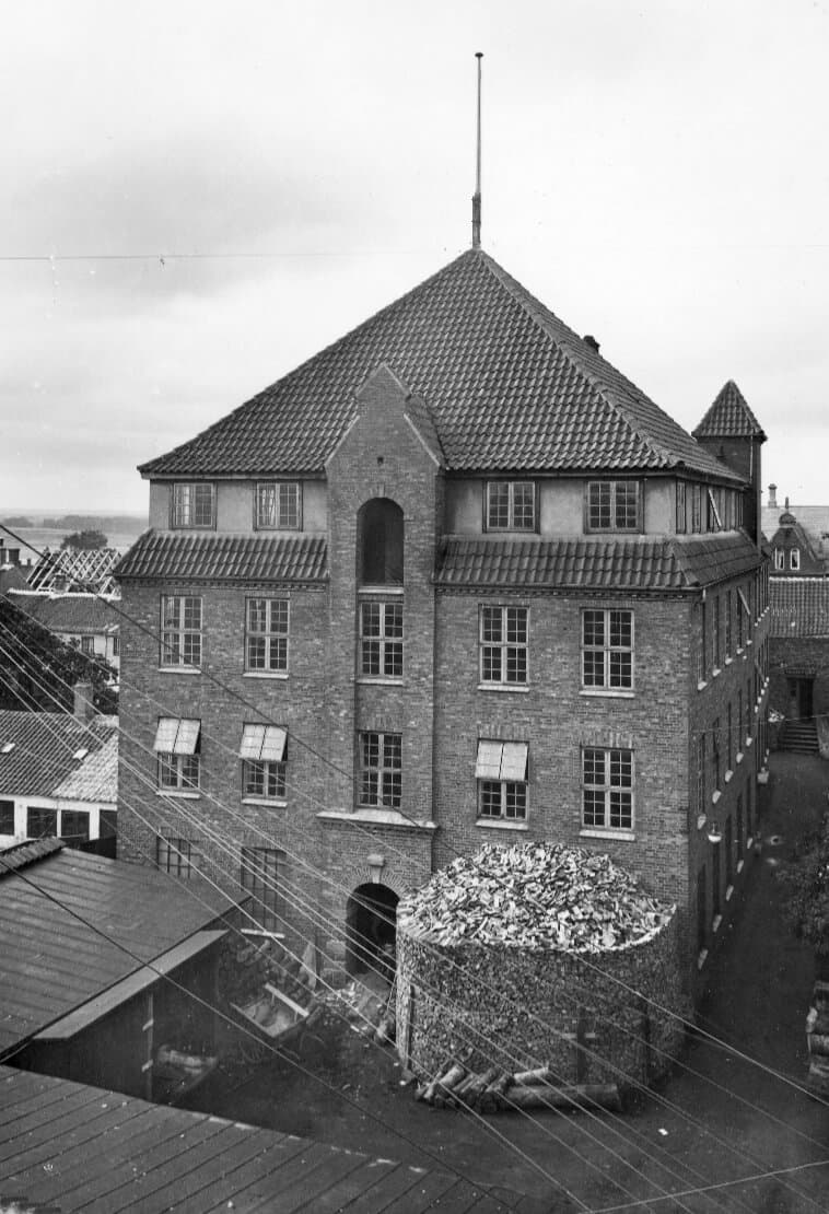 Pictured here is the new factory in Østergade around 1930. The waste wood from production was kept in front of the building to be sold as firewood. During World War II, the dried wood was used to kindle the generators on the local busses.