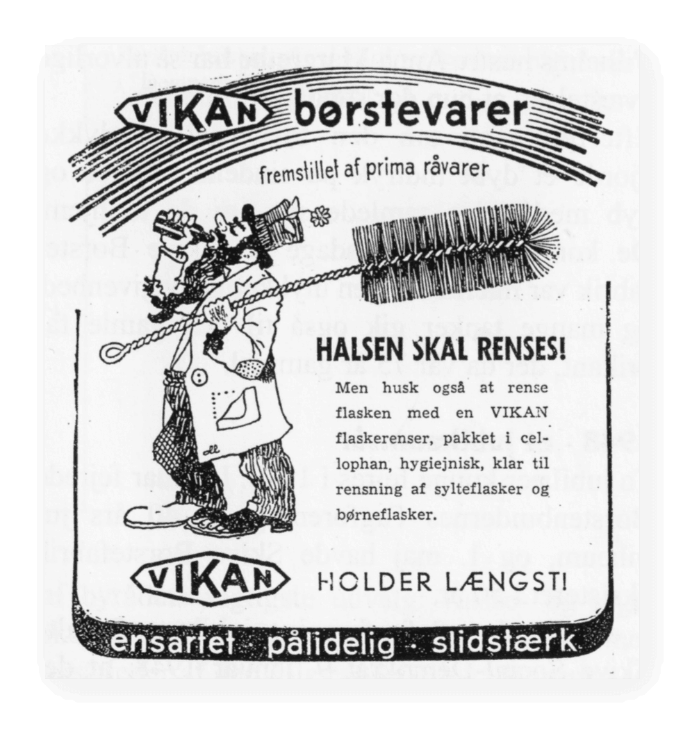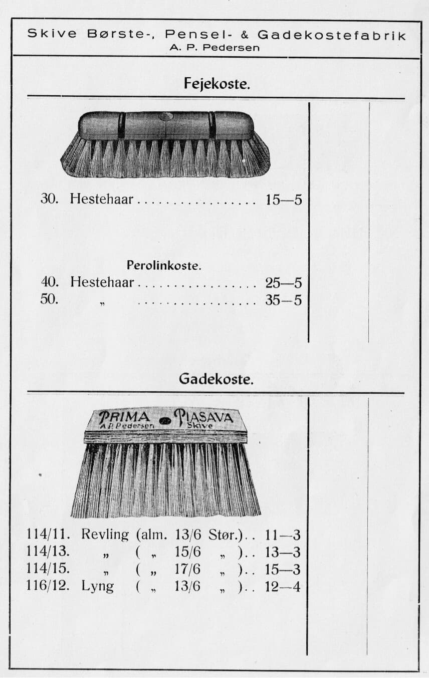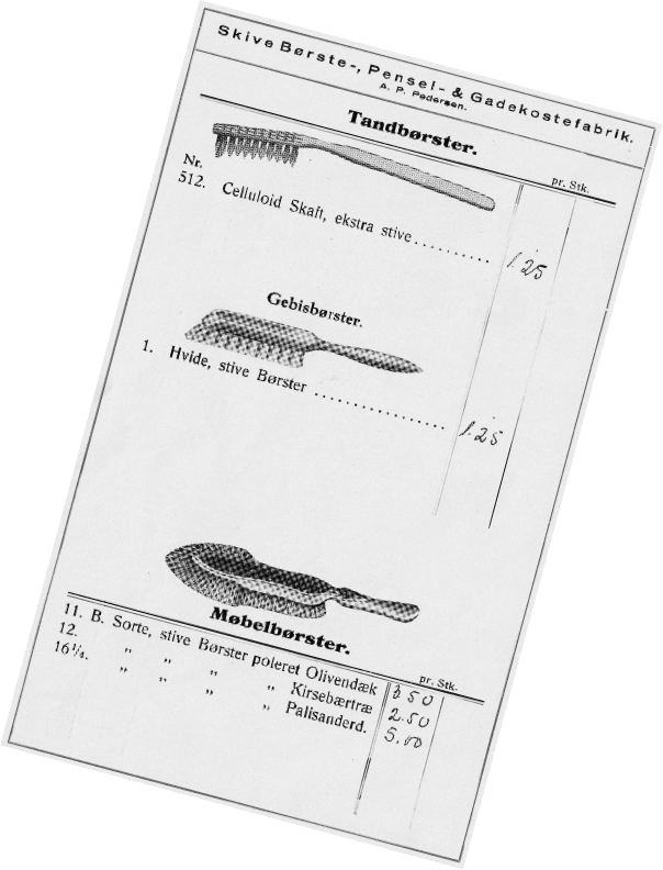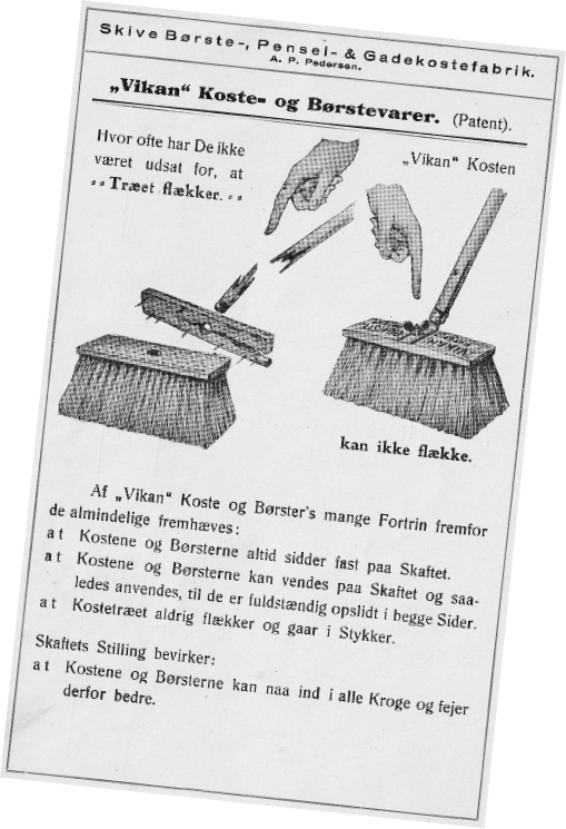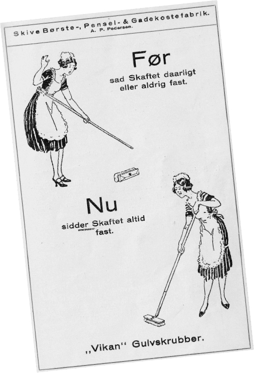 At the end of the 1920s, A.P. Pedersen bought a patent from a man in Thisted. He had invented a fitting on a broom handle that made it possible to rotate a broom when it was worn out on one side. The man put a large sticker on the handle showing a cleaning lady and a scrubber with the text “Vi-kan”. From a price list in 1930. The company made brushes for all purposes…including for artificial teeth at a time where it was normal for younger people to have their teeth removed after their confirmation.