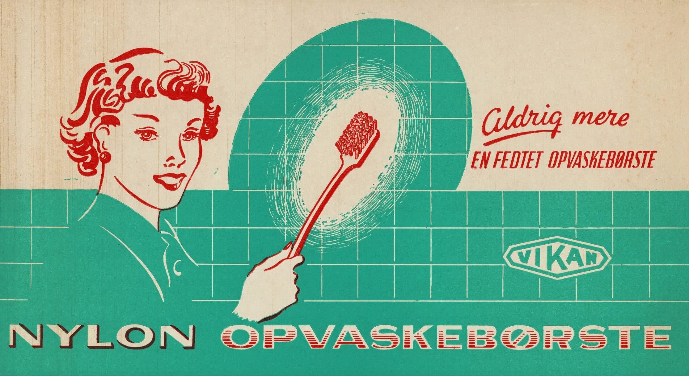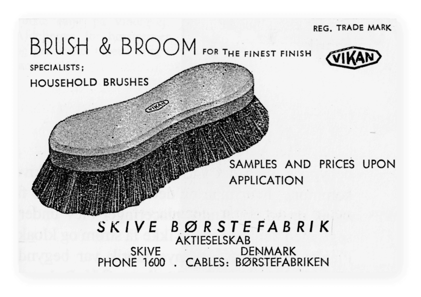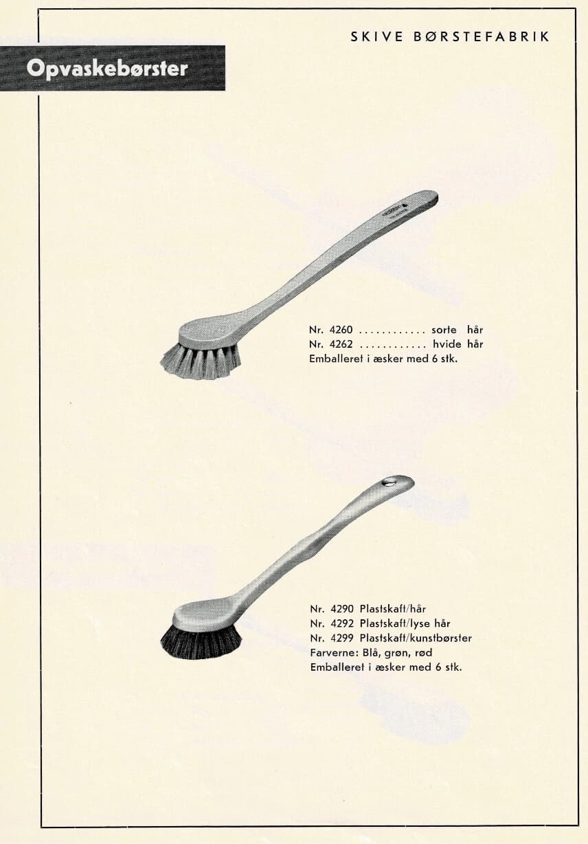 At the end of the 1920s, A.P. Pedersen bought a patent from a man in Thisted. He had invented a fitting on a broom handle that made it possible to rotate a broom when it was worn out on one side. The man put a large sticker on the handle showing a cleaning lady and a scrubber with the text “Vi-kan”. From a price list in 1930. The company made brushes for all purposes…including for artificial teeth at a time where it was normal for younger people to have their teeth removed after their confirmation.