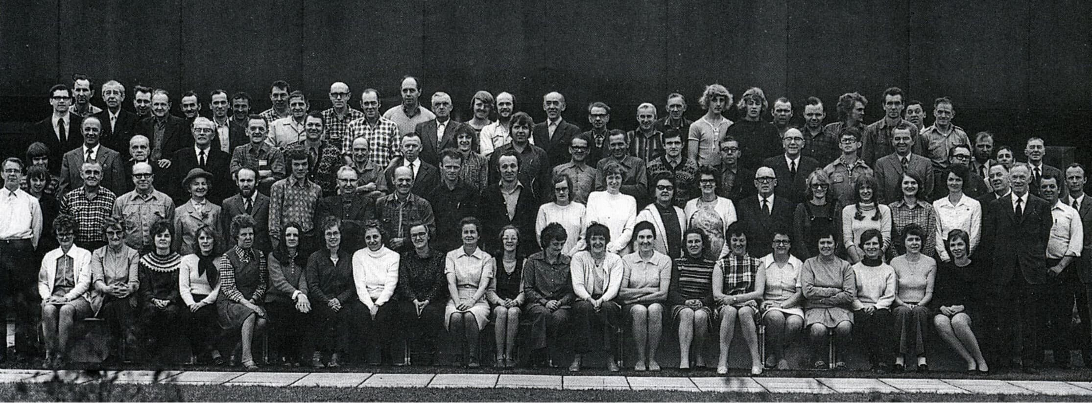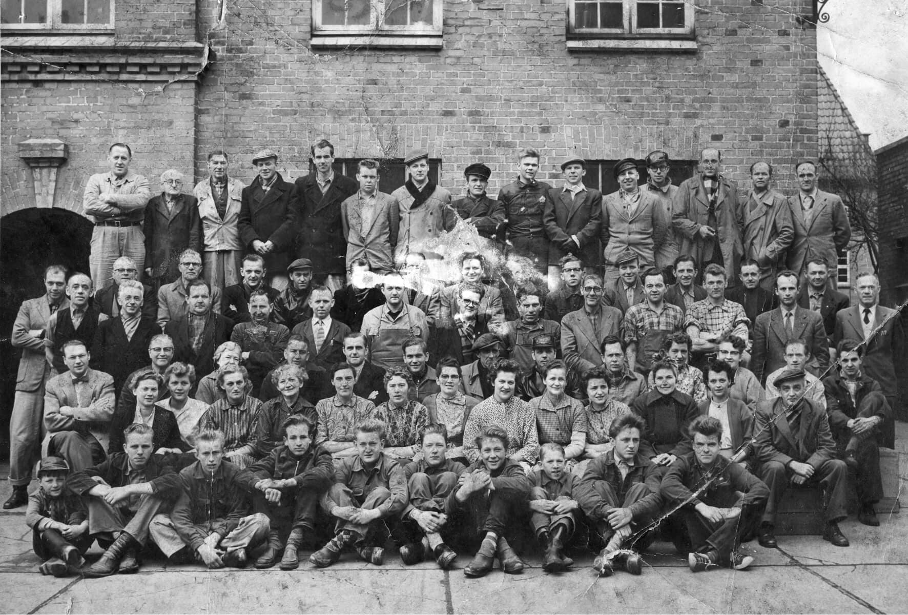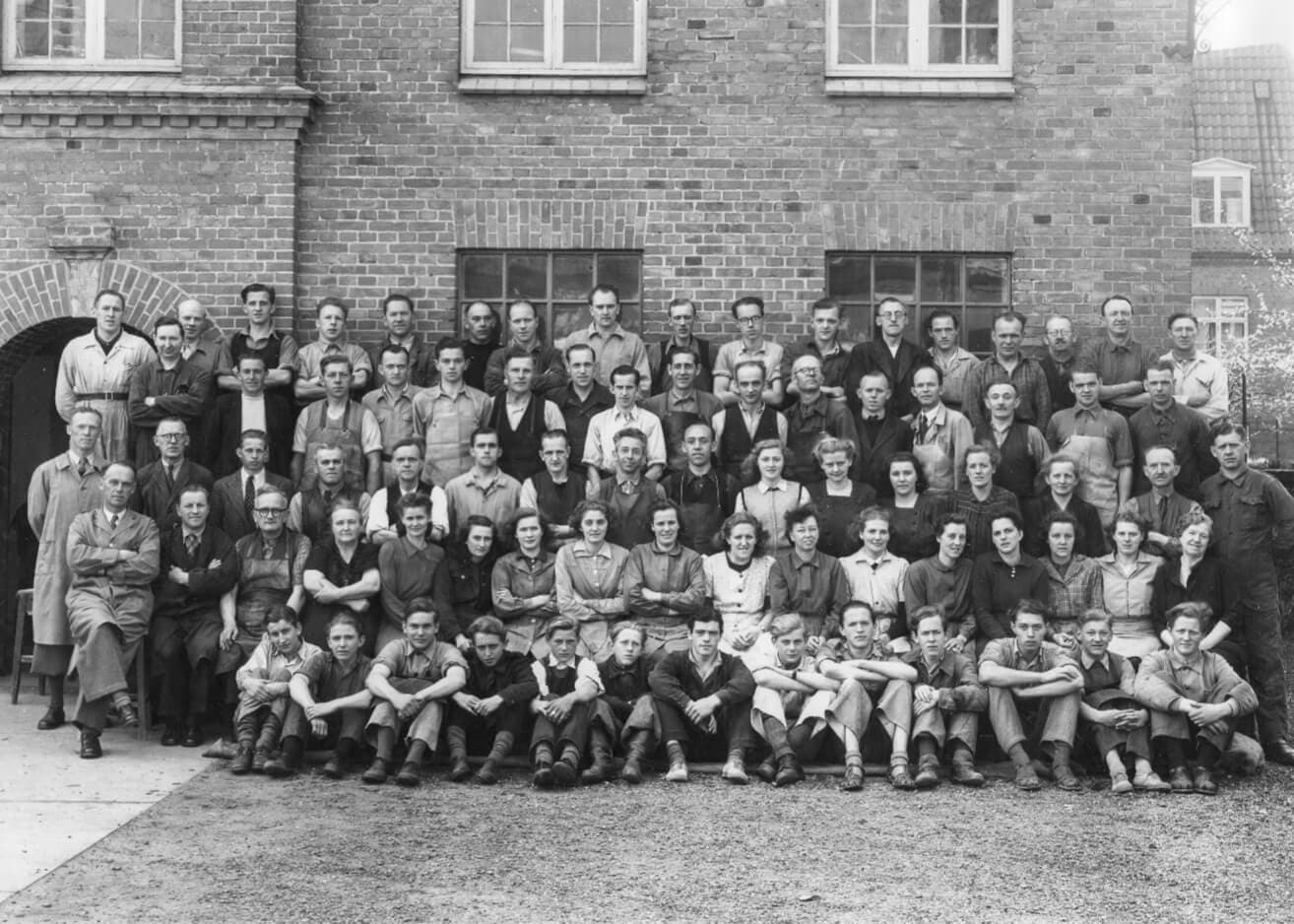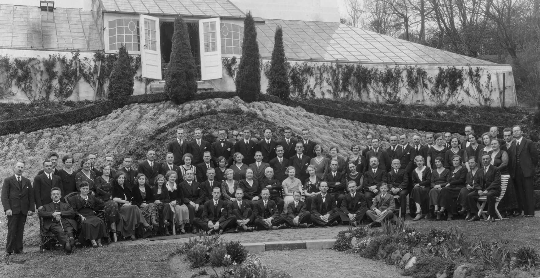 On the anniversary on May 1st, 1933, all employees were invited to his and Marie’s home, where they were photographed in the garden in front of their villa on Holstebrovej 23. A.P. Pedersen and his wife are in the middle of the picture with their children and their spouses on both sides.