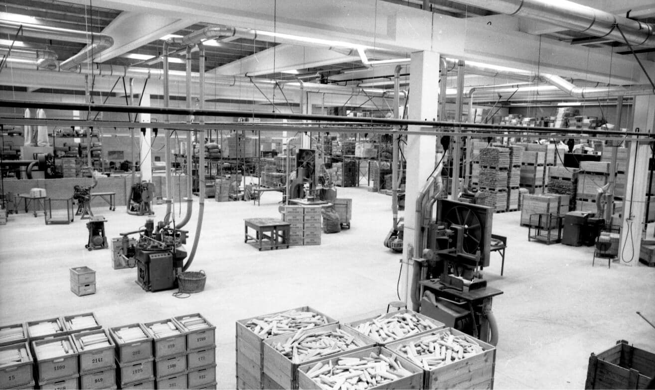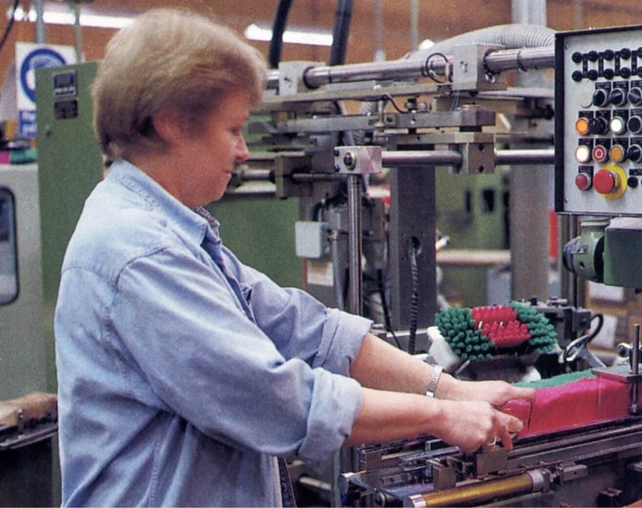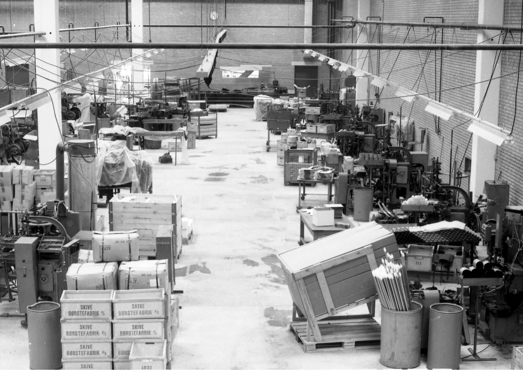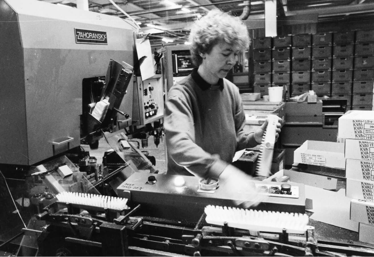 A sign reading “Vikan” was placed on the gable of the new factory. The name “Skive Børstefabrik” was no longer suitable for an export company, and “Vikan” was slowly put on all products. During the 1960s, production became more and more mechanized. The work formerly done by hand was now done with new machines.